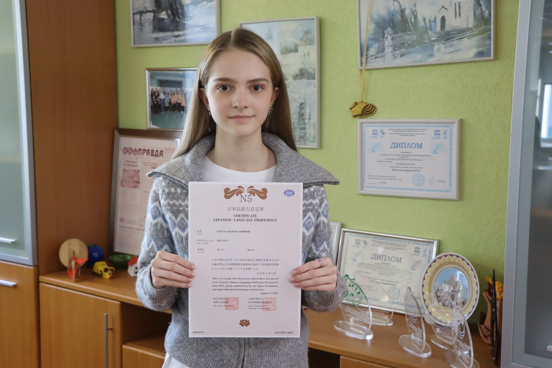 Ученица 9м1 класса Международной лингвистической школы Екатерина Киселева успешно прошла тестирование и получила сертификат, подтверждающий 5 уровень знания японского языка. Екатерина целеустремленно изучает японский язык и планирует связать свою будущую профессию с этим восточным языком.