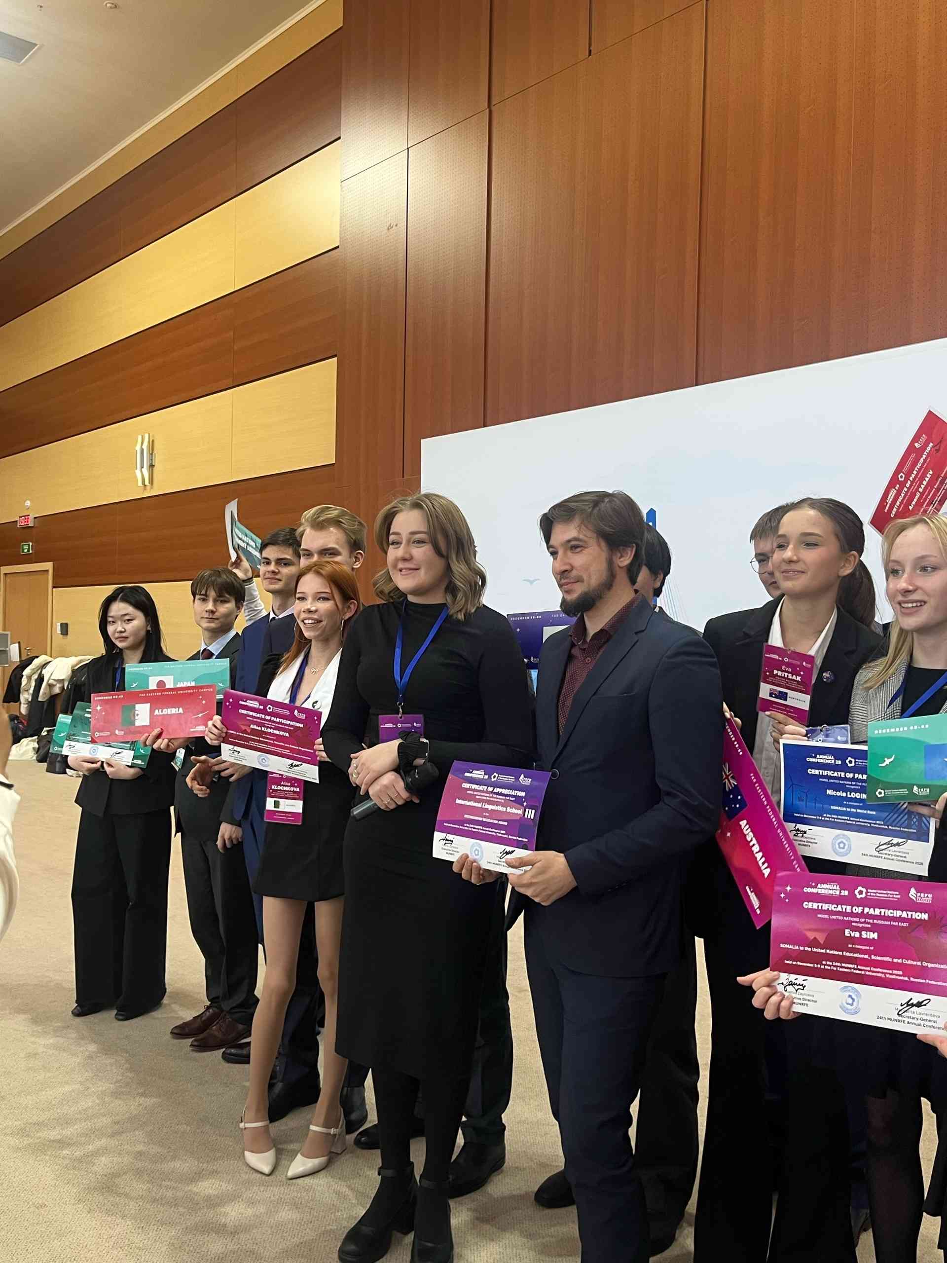 Двадцать четыре ученика Международной лингвистической школы приняли участие ежегодной конференции «Модель ООН на Дальнем Востоке» в ДВФУ, где продемонстрировали хорошее понимание взаимодействия в международной организации. Наставниками школьников стали учителя английского языка Вероника Романовна Тананыкина и Владимир Александрович Тананыкин.