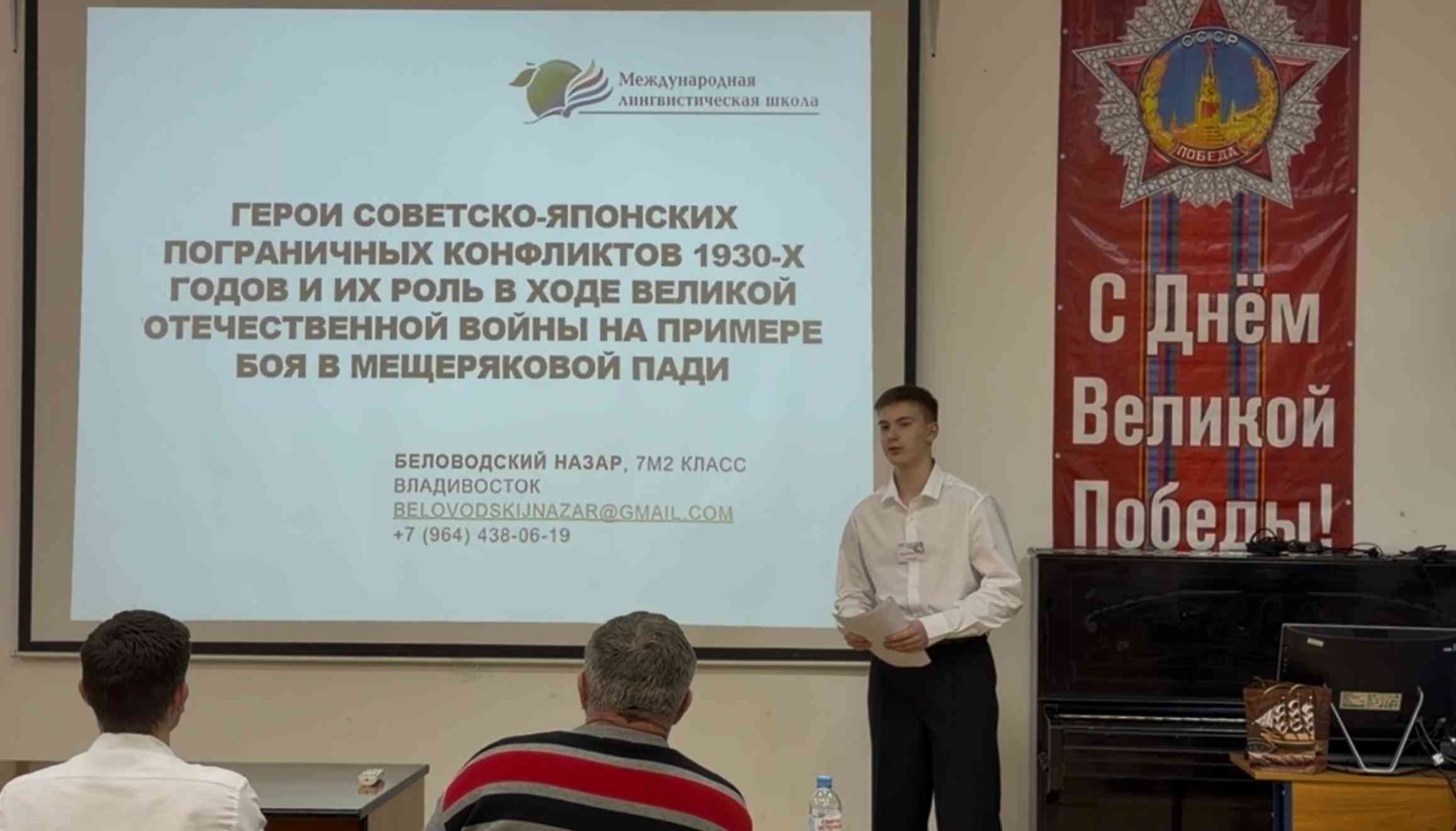 Исследовательская работа ученика 7м2 класса Международной лингвистической школы Назара Беловодского «Герои советско-японских пограничных конфликтов 1930-х годов и их роль в ходе Великой Отечественной войны на примере боя в Мещеряковой пади» вошла в число лучших работ на Всероссийском фестивале творческих открытий и инициатив «Леонардо» (Москва) на секции «История, искусство, культура». Назар занял 3 место в финале конкурса.