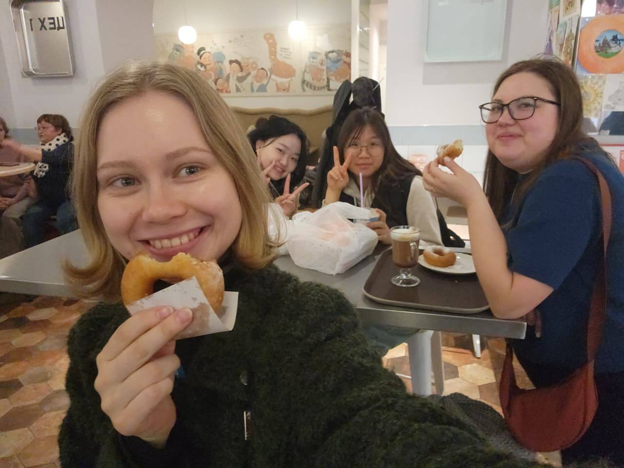 В Санкт-Петербурге мне больше всего понравились пышки. Два года назад я уже их пробовала, и тогда они мне очень понравились. Я рассказала маме, и она тоже захотела попробовать. Сначала мы купили десять пышек, но узнали, что их нужно съесть в течение дня. Поэтому мы с Джию вернулись в отель и съели все десять пышек, что было довольно тяжело.